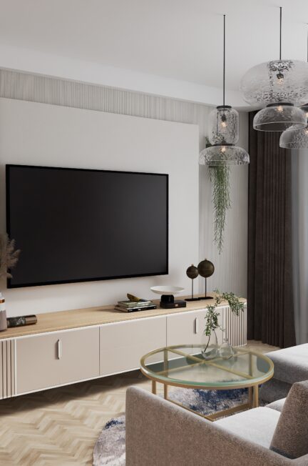 Starannie dobrane dodatki – stolik kawowy, dywan oraz szafka RTV – podkreślają stylistyczną spójność całego projektu, a jednocześnie wprowadzają elementy miękkości i elegancji.