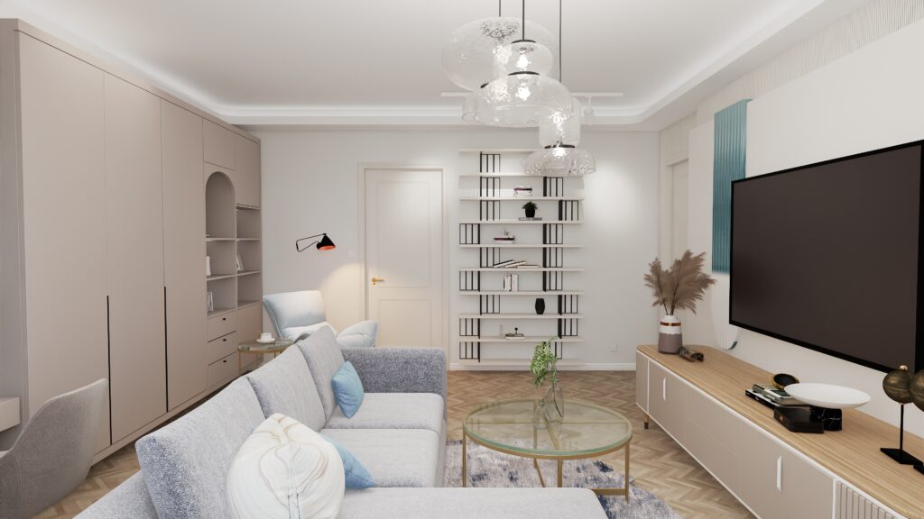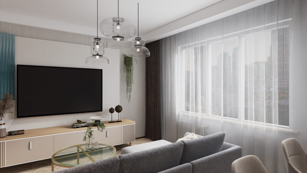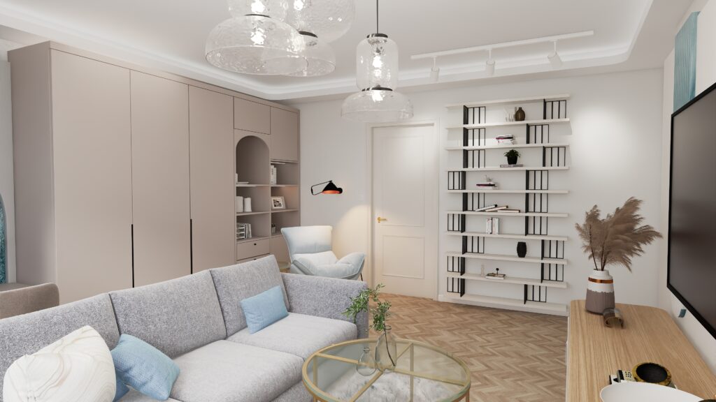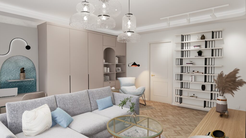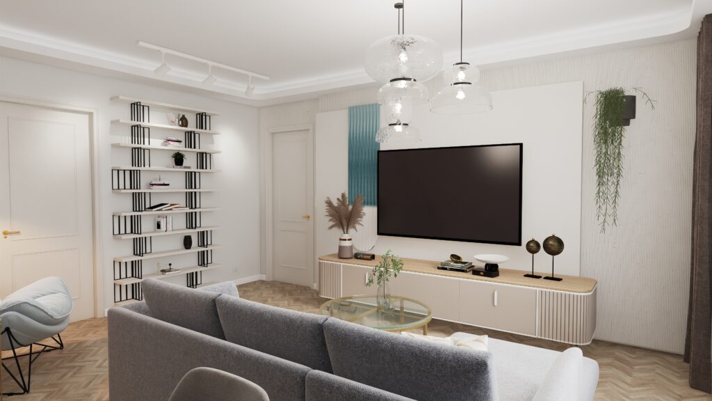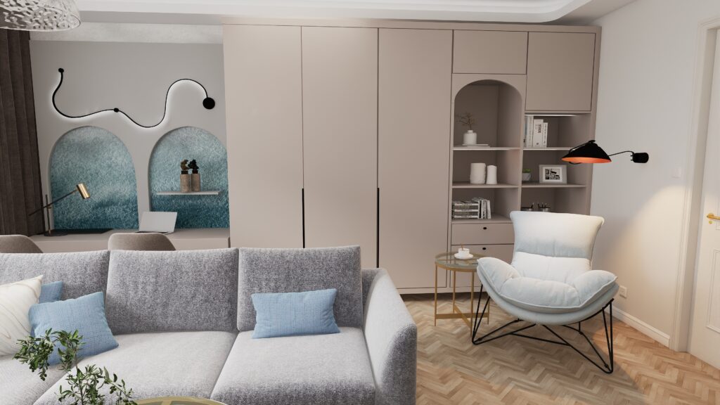 Ten projekt salonu powstał z myślą o stworzeniu harmonijnej, komfortowej i funkcjonalnej przestrzeni, która w naturalny sposób łączy w sobie strefę wypoczynkową oraz miejsce do pracy zdalnej. Kolorystyka wnętrza opiera się na zgaszonej bieli i eleganckim kaszmirze, przełamanych ulubionym akcentem kolorystycznym inwestorów – subtelnym, kojącym turkusowo – błękitnym odcieniem.